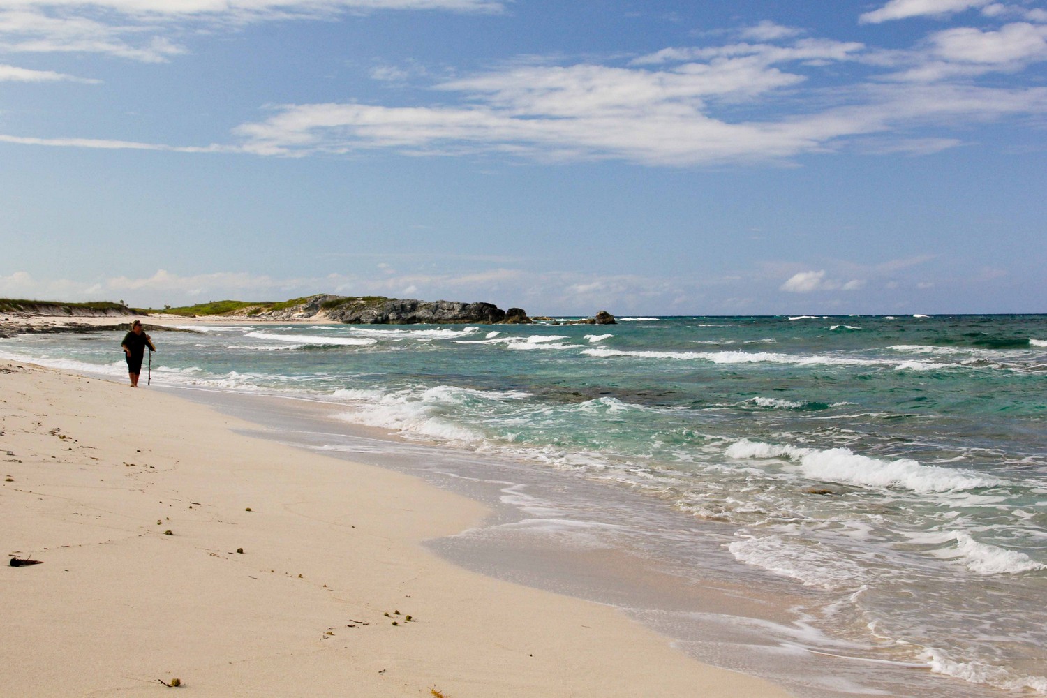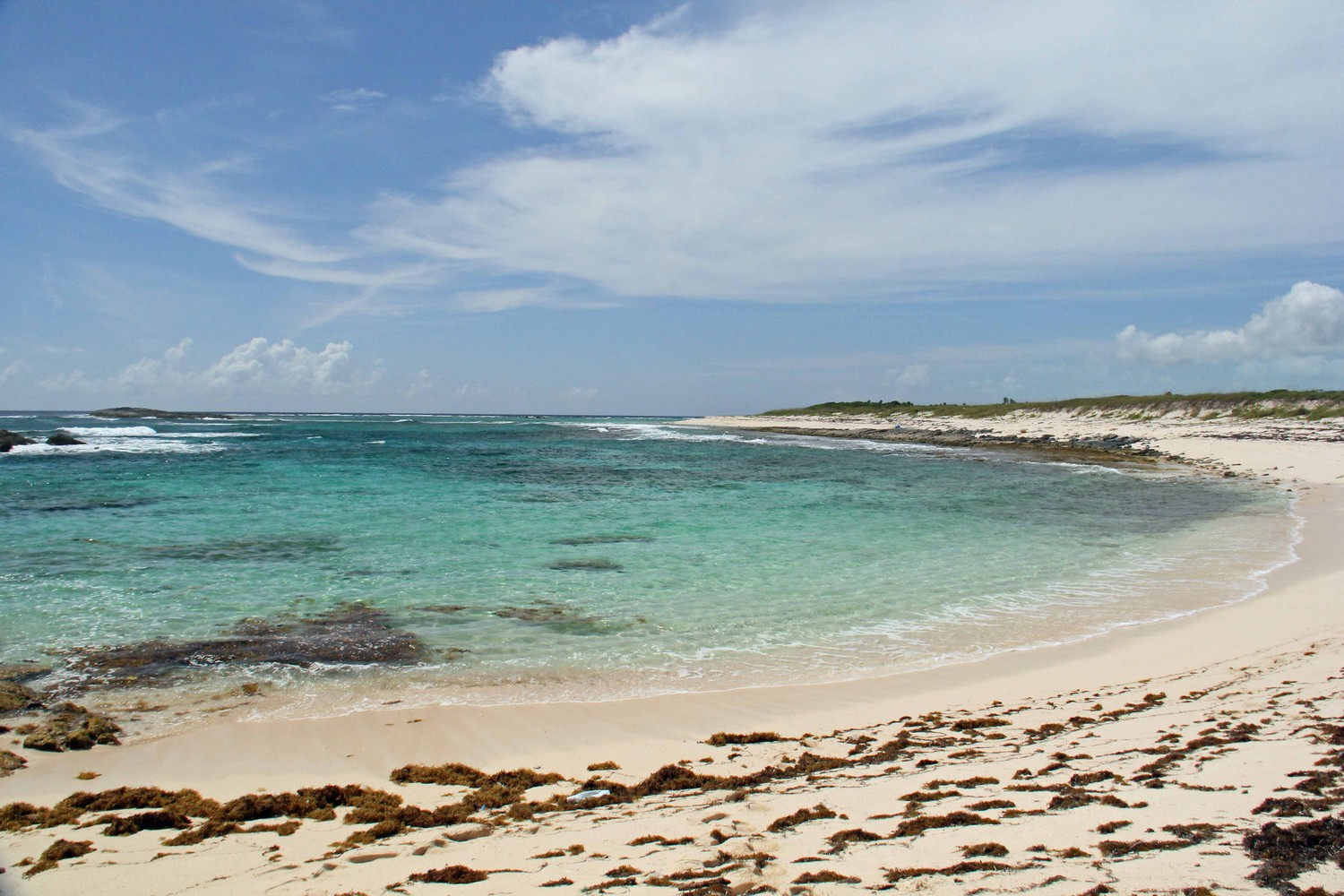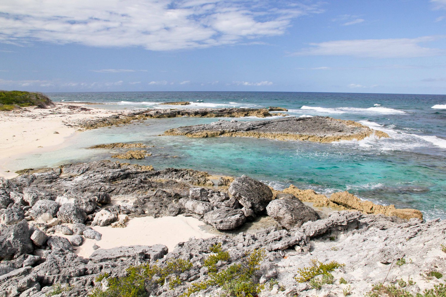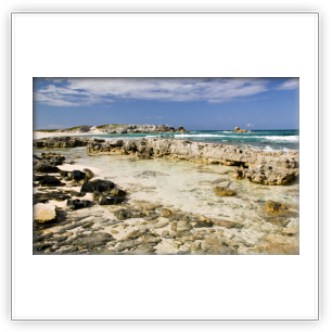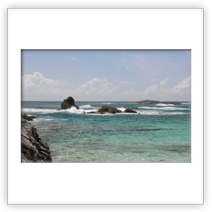 The northern beach has several rocky outcrops close to shore which provide for some small protected pools. The mid section is deep adjacent to the promontory and being somewhat unprotected can have some larger waves and stronger currents. This section is only recommended for strong swimmers and experienced snorkelers no matter what the conditions. As you go south in this section, there is a long section of rock ledges along the beach. The bottom in front of these ledges are also rocky, or perhaps a better descriptor is pebbly. However, past these pebbles about 10-30 yards out, the bottom gets sandy. Once you round the point, the southern beach and water are all sand. Because of the protection the off shore reefs provide, the southern section may be suitable for novice snorkelers depending on conditions.