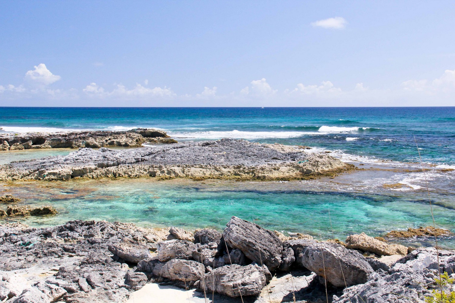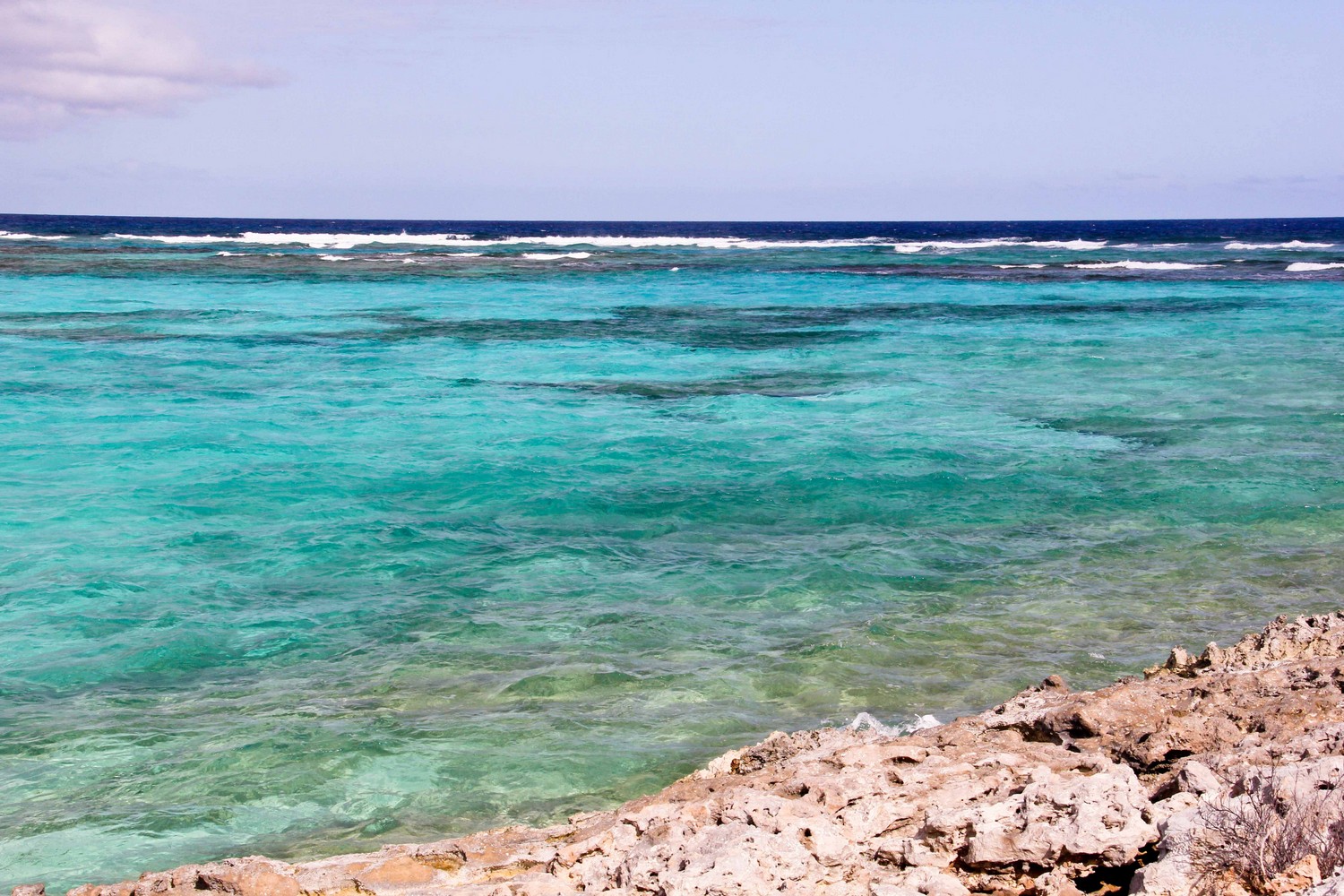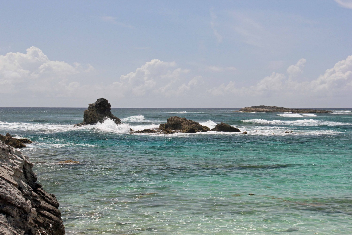 The northern beach has several rocky outcrops close to shore which provide for some small protected pools. The mid section is deep adjacent to the promontory and being somewhat unprotected can have some larger waves and stronger currents. This section is only recommended for strong swimmers and experienced snorkelers no matter what the conditions. As you go south in this section, there is a long section of rock ledges along the beach. The bottom in front of these ledges are also rocky, or perhaps a better descriptor is pebbly. However, past these pebbles about 10-30 yards out, the bottom gets sandy. Once you round the point, the southern beach and water are all sand. Because of the protection the off shore reefs provide, the southern section may be suitable for novice snorkelers depending on conditions.